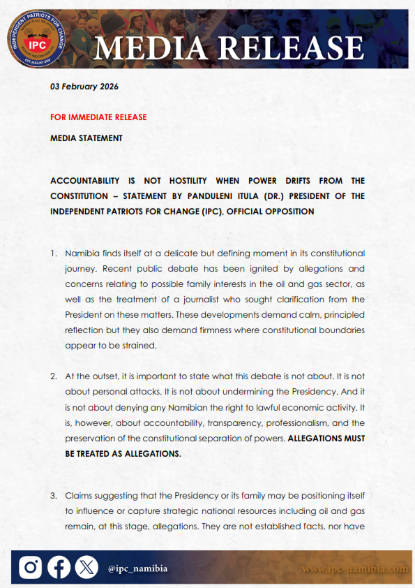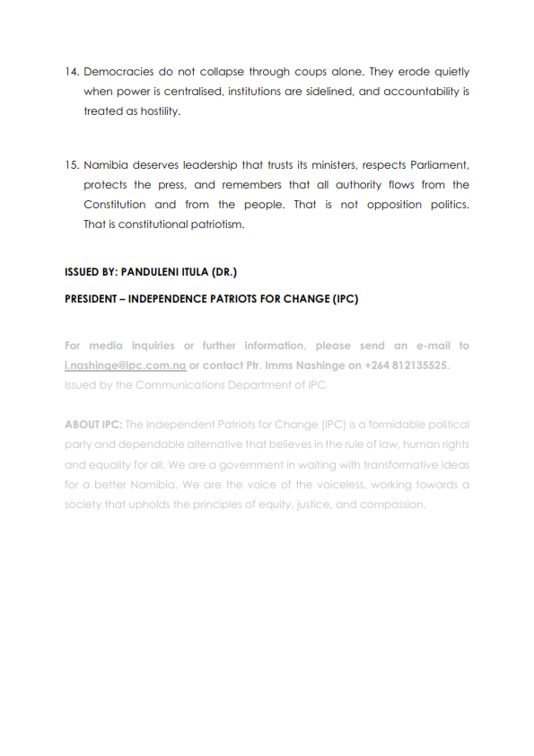 IPC President, Dr Panduleni Itula's official statement on Accountability and on the ill treatment of a journalist by State House Feb 30 min read
